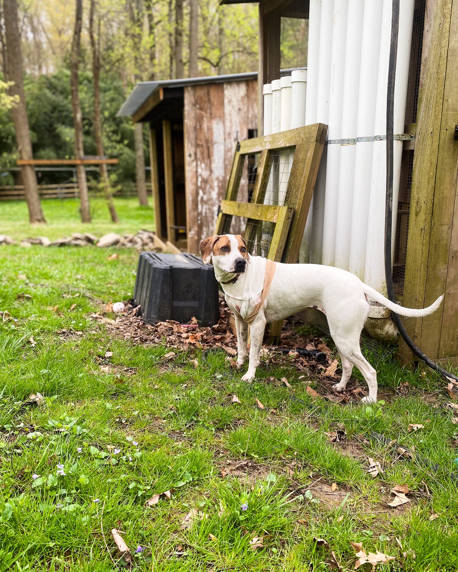 Pearl, my love! She ran out into the darkness (was it the coyote?) with fervor — straight into the new wheelbarrow we left in the path. She is recovering, but I do wonder if the wheelbarrow saved her from a worse encounter.