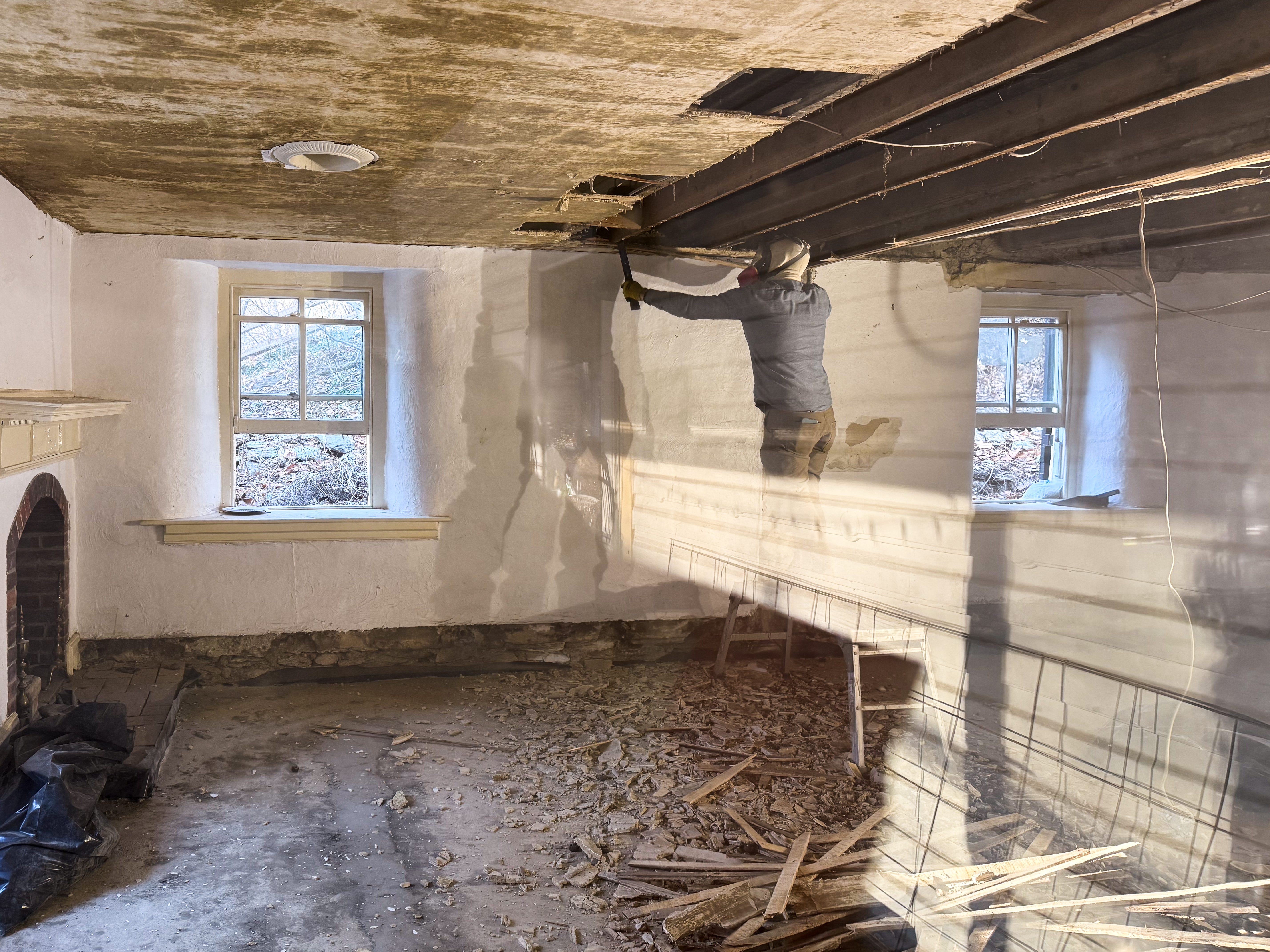 Now that the concrete has cured, Walter has been tearing out the frankensteined plastic and plastered amalgum on walls and ceiling in The Rat Room. Yesterday he found The Stone that confirms my research - our house was built in the 1800s and not 1775 as declared in the listing. Wah. Just numbers anyway, but I love the idea older. Before this part of the world had the name: United States of America.